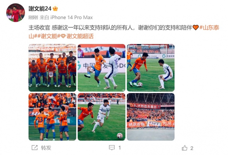 中超第29轮,泰山队主场作战 2-1战胜津门虎,这也是泰山队赛季主场作战 收官战。赛后,谢文能更新社媒纪念,法甲聚焦他写道:主场作战 收官 感谢这一年以来支持球队的所有人,谢谢你们的支持和陪伴。