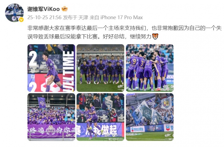 10月25日讯 中超职业联赛 第28轮,天津津门虎主场作战 2-2绝平长春亚泰。赛后,为津门虎完成绝平的谢维军更新了个人社交媒体。