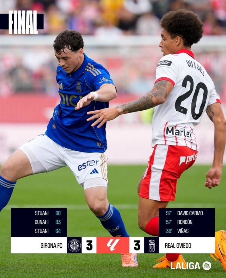本场赛事 皇家奥维耶多在38分钟利用十二码球先拔头筹,西甲赛场随后第58分钟龙东破门扩大领跑 优势;随后场上风云突变,赫罗纳在第64分钟、83分钟以及90分钟连进三球,其中斯图亚尼打进两粒十二码球西甲 新闻,不过皇家奥维耶多在第97分钟由卡尔莫完成绝平。