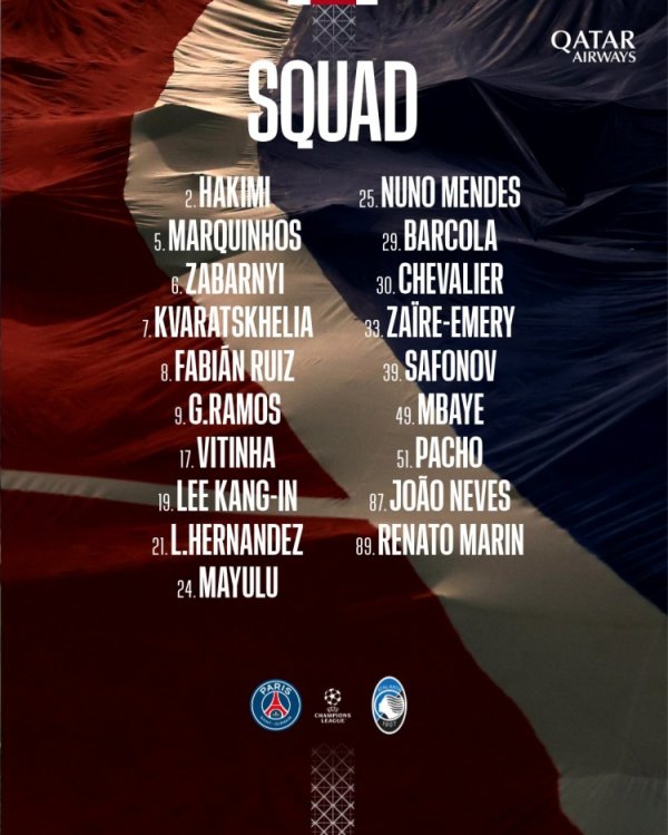 巴黎公布欧冠战亚特兰大大名单:维蒂尼亚领衔,登贝莱、杜埃缺席