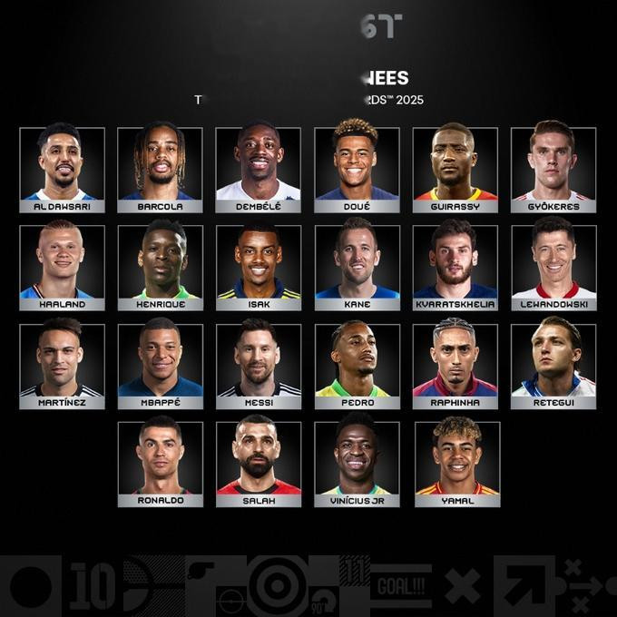 新科金球奖得主登贝莱领衔该名单,梅西、C罗、姆巴佩、亚马尔等众多球星在列。