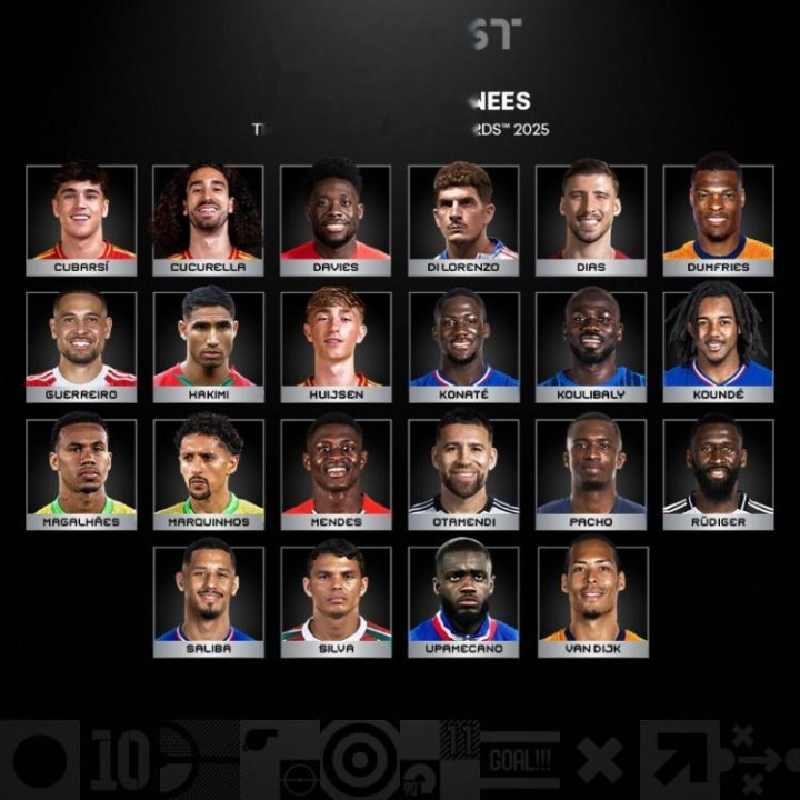 库巴西(巴萨)、库库雷利亚(切尔西)、阿方索·戴维斯(拜仁)、迪洛伦佐(那不勒斯)、鲁本·迪亚斯(曼城)、邓弗里斯(国米)、格雷罗(拜仁)、阿什拉夫(巴黎)、赫伊森(伯恩茅斯/皇马)、科纳特(利物浦)、库利巴利(利雅得新月)、孔德(巴萨)、加布里埃尔(阿森纳)、马尔基尼奥斯(巴黎)、努诺·门德斯(巴黎)、奥塔门迪(本菲卡)、威廉·帕乔(巴黎)、吕迪格(皇马)、萨利巴(阿森纳)、蒂亚戈·席尔瓦(弗鲁米嫩塞)、于帕梅卡诺(拜仁)、范戴克(利物浦)