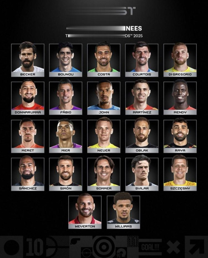 阿利松(利物浦)、布努(利雅得新月)、迪奥戈·科斯塔(波尔图)、库尔图瓦(皇马)、迪格雷戈里奥(尤文)、多纳鲁马(巴黎/曼城)、法比奥(弗鲁米嫩塞)、约翰·维克托(博塔弗戈/诺丁汉森林)、达米安·马丁内斯(维拉)、爱德华·门迪(吉达国民)、梅雷特(那不勒斯)、米耶尔(蓝十字)、诺伊尔(拜仁)、奥布拉克(马竞)、拉亚(阿森纳)、罗伯特·桑切斯(切尔西)、乌奈·西蒙(毕尔巴鄂竞赛 )、索默(国米)、斯维拉尔(罗马)、什琴斯尼(巴萨)、韦弗顿(帕尔梅拉斯)、隆文·威廉姆斯(马梅洛迪日落)苏超62329人