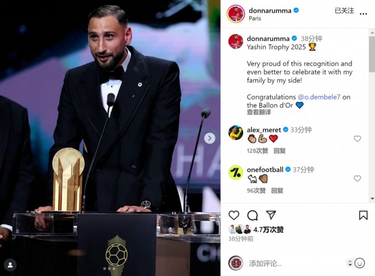 多纳鲁马社媒晒出领奖的照片,法甲聚焦并写道:2025年雅辛奖🏆非常自豪能获得这份认可,能与家人一起庆祝感觉更棒了!”