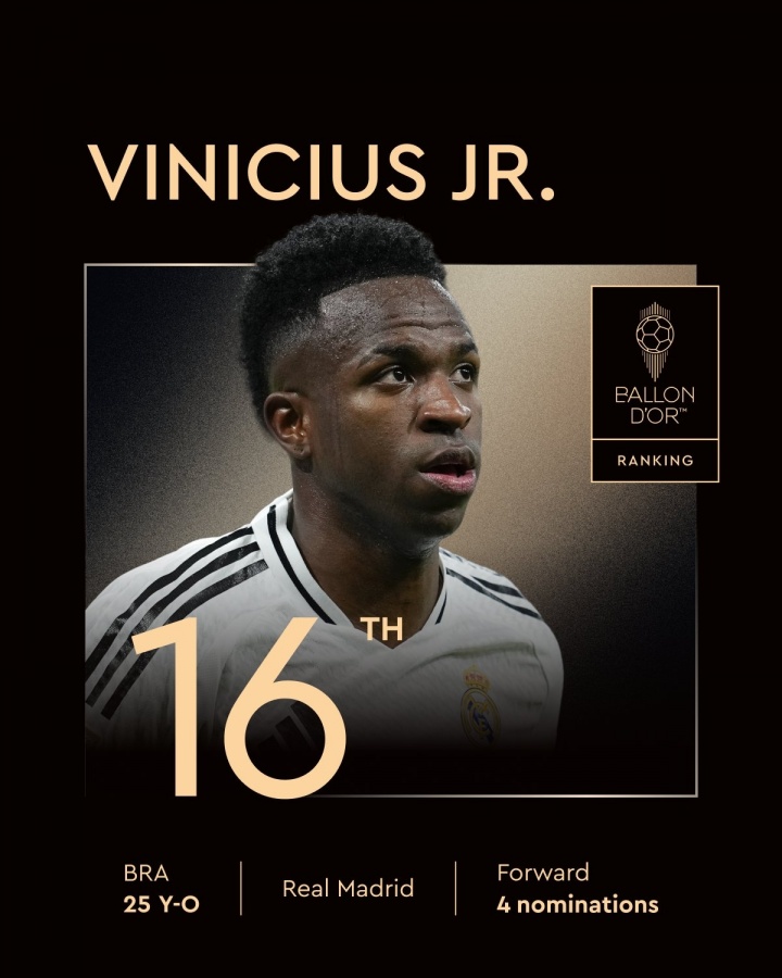 9月23日讯 2025年金球奖排名公布,维尼修斯最终排名第16。