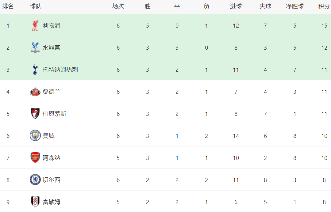 在积分榜上,利物浦依然排名榜首,5胜1负拿到15分。排名第2的是大爆冷体育选手 水晶宫。水晶宫3胜3平,拿到12分。水晶宫是唯一不败战绩的球队,让人惊讶。热刺、桑德兰和伯恩茅斯都是11分,排名第3到第5。曼城3胜1平2负,拿到10分即时投注即时投注体育赛事,排名第6。阿森纳也是10分,排名第7。第8 的是8分的切尔西。曼联2胜1平3负,只拿到7分,排名掉到第14。