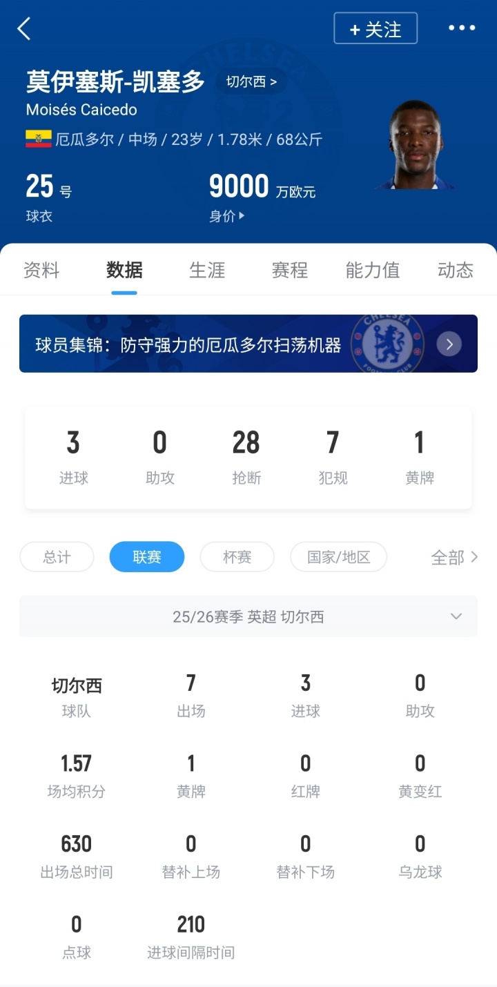 10月15日讯 德转将于17日更新英超球员身价,今天他们预热了切尔西中场球员凯塞多的身价变动。