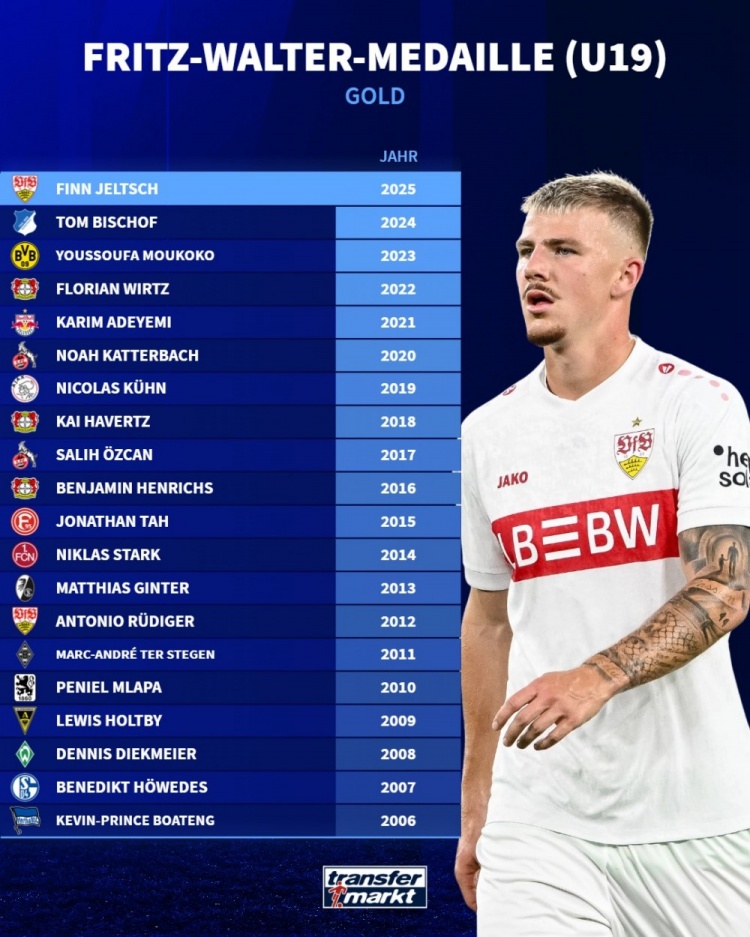 10月17日讯 斯图加特中卫耶尔奇当选德国足协年度最U19最佳新秀,法甲聚焦德国转会市场列出了历届德国U19年度最佳新秀的名单。