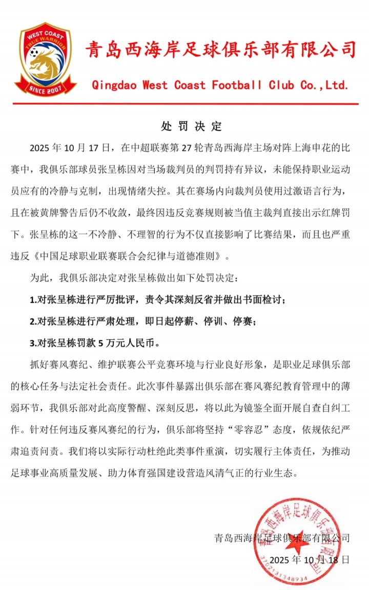 为此,我俱乐部决定对张呈栋做出如下处罚决定: