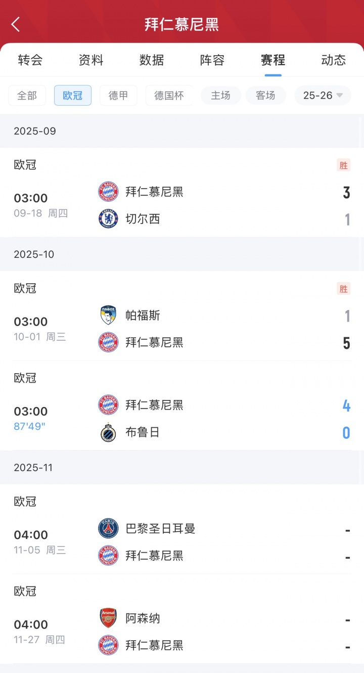 10月23日讯 北京时间10月23日星期四,欧冠职业联赛 阶段第3轮,西甲赛场拜仁4-0轻取布鲁日迎来欧冠3连胜!拜仁开赛3轮欧冠打进12球(3-1切尔西、5-1帕福斯、4-0布鲁日),未来两轮将会分别对阵巴黎和阿森纳!