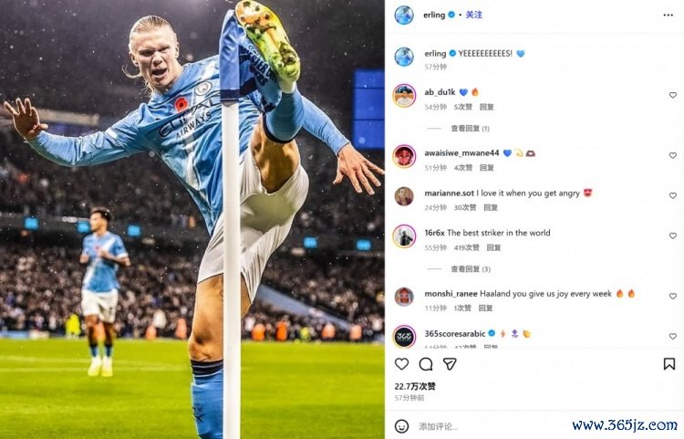 失点后头槌破门!哈兰德社媒晒飞踢角旗杆庆祝照:YES