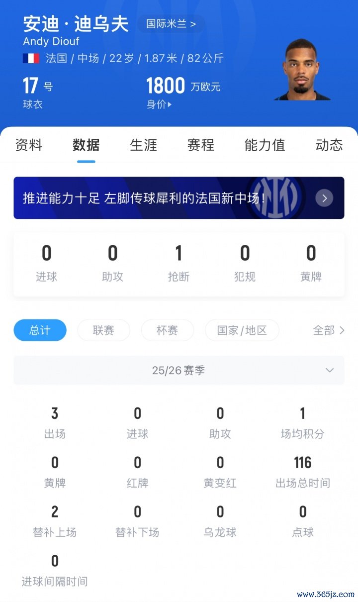 迪乌夫现年22岁,本赛季仅为国米出场3次,共计116分钟,没有得分 和助功 ,他现身价1800万欧,与国米的合同同样在2030年到期。