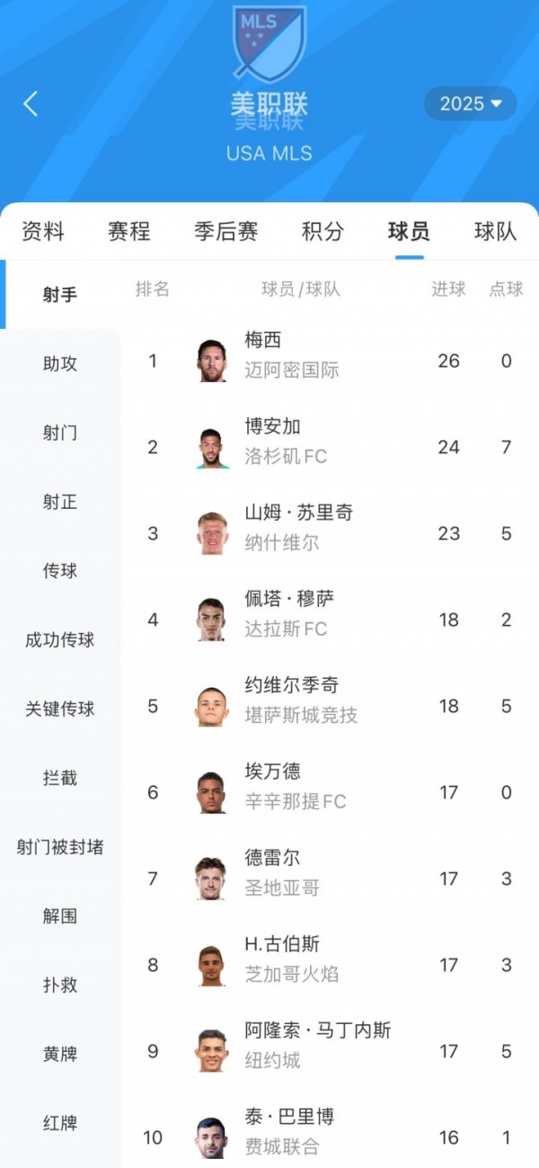 冲击助功 王!梅西26球0点领跑MLS射手榜,15助排名助功 榜第二